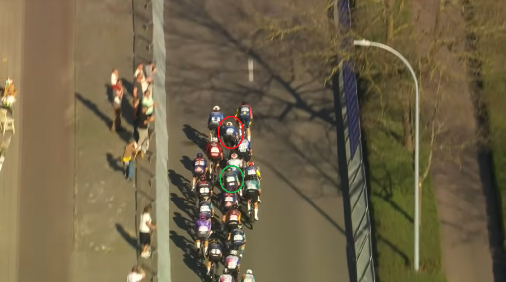 Wir beginnen damit, dass Jasper Philipsen (rot) noch zwei Teamkollegen vor sich hat und sich in bester Position befindet. Tim Merlier (grün) hat noch einen Teamkollegen bei sich, ist aber bereits von ihm getrennt.