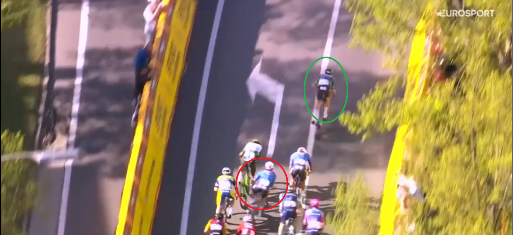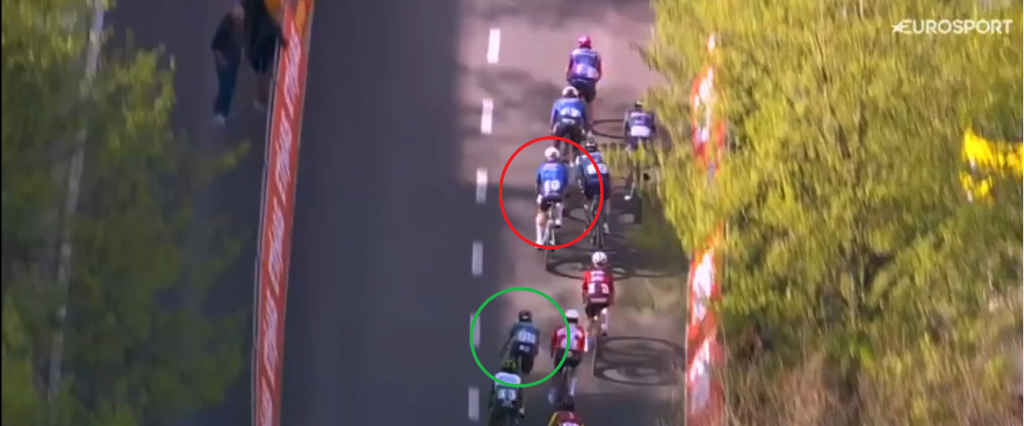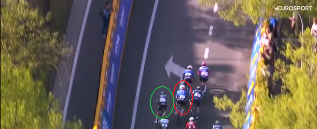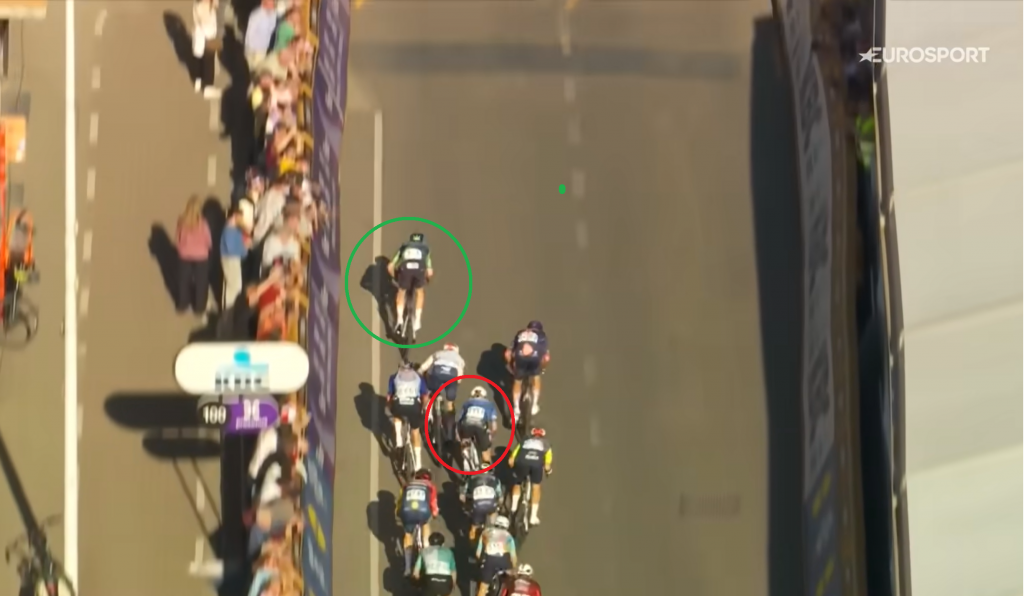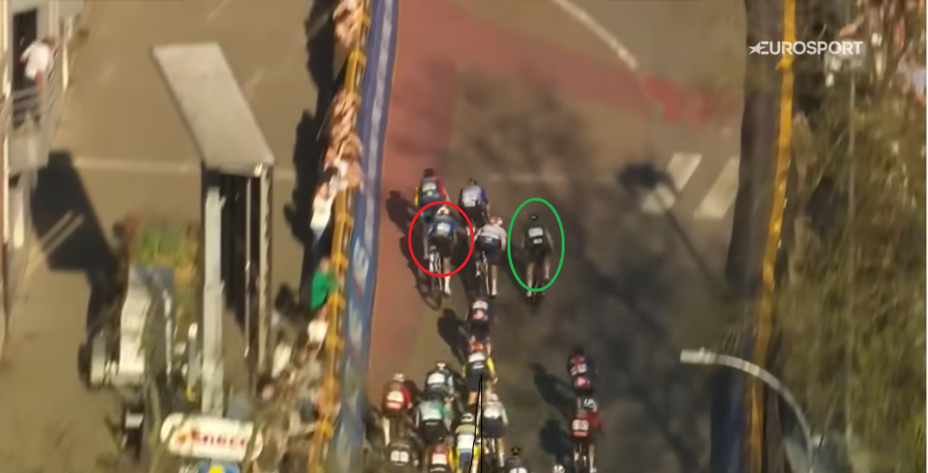 Schon längst innerhalb des letzten Kilometers angekommen, kämpft sich Tim Merlier (grün) nach vorne. Die Lücke ist sichtbar. Währenddessen wird Gerben Thijssen (rot) der Sprint eigentlich mustergültig angefahren. Am Hinterrad von Merlier sehen wir übrigens Fernando Gaviria.
